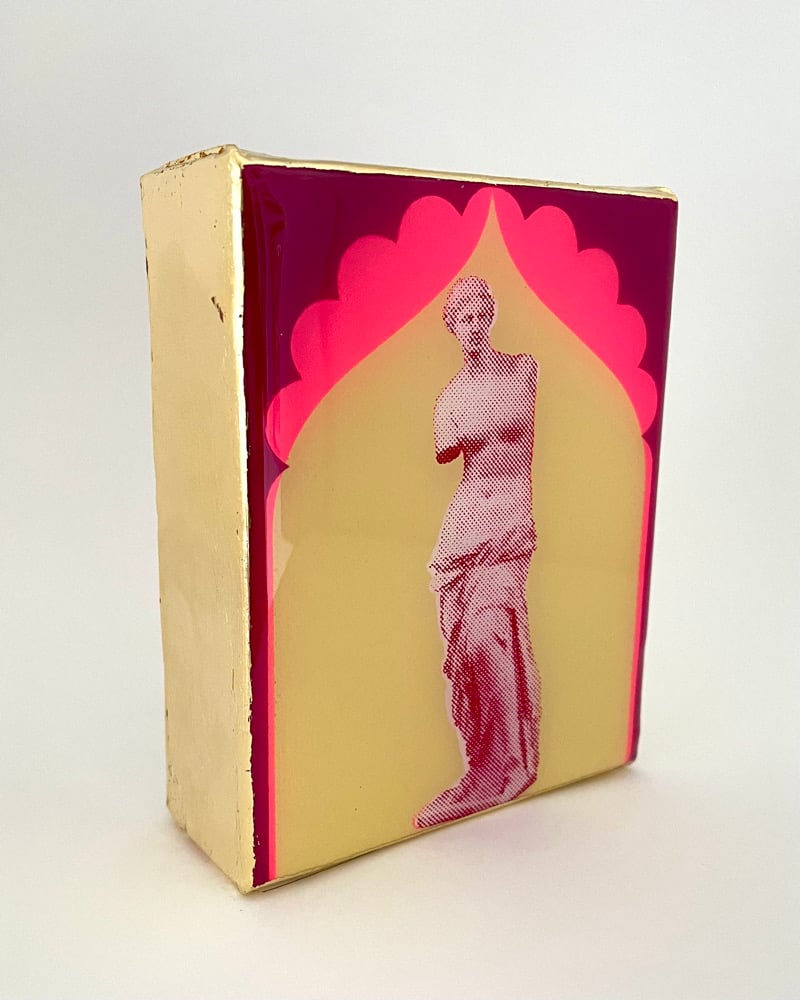 Hand finished screen print on canvas with acrylic, enamel, resin and gold leaf.