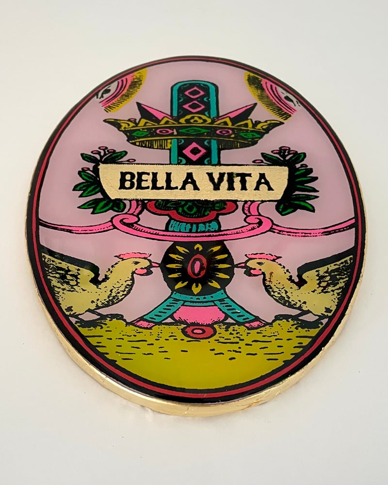Hand painted screenprint with acrylic and enamel on laser cut wood coated in resin and gold leaf edges.