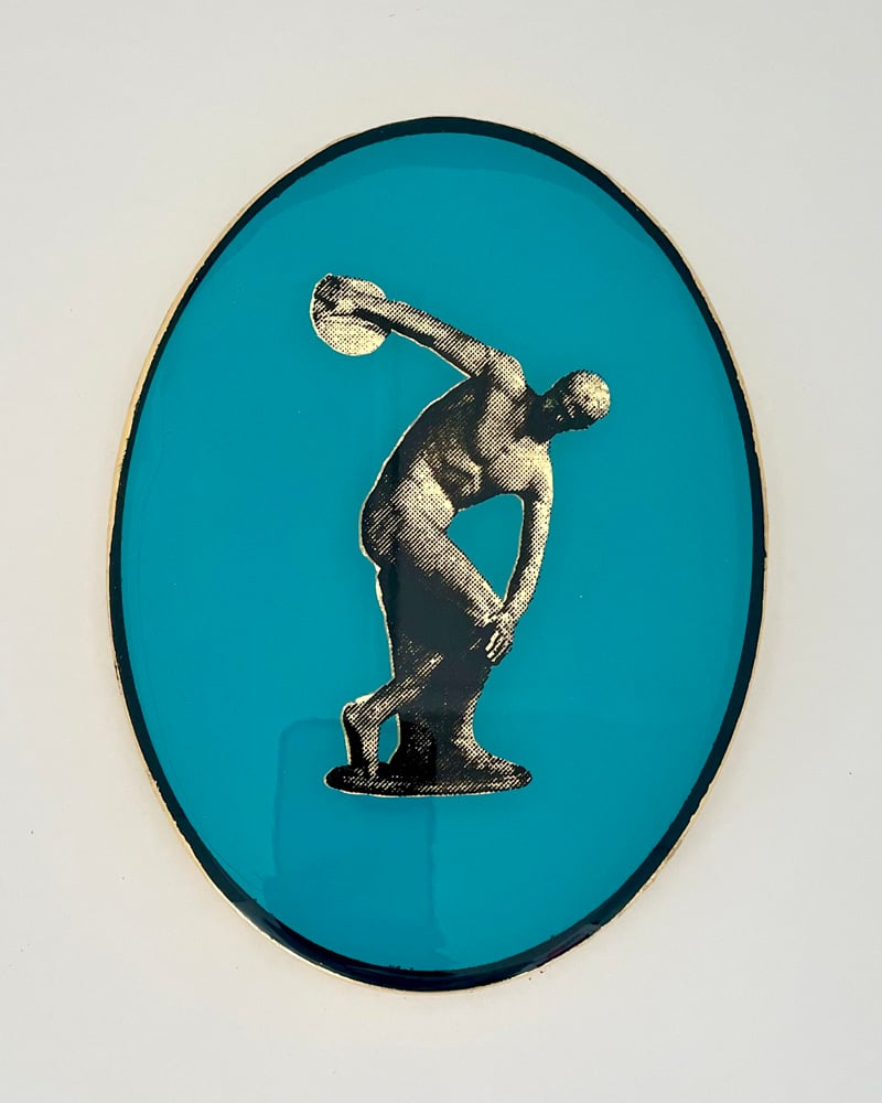 Hand painted screenprint with acrylic and enamel on laser cut wood coated in resin and gold leaf edges.