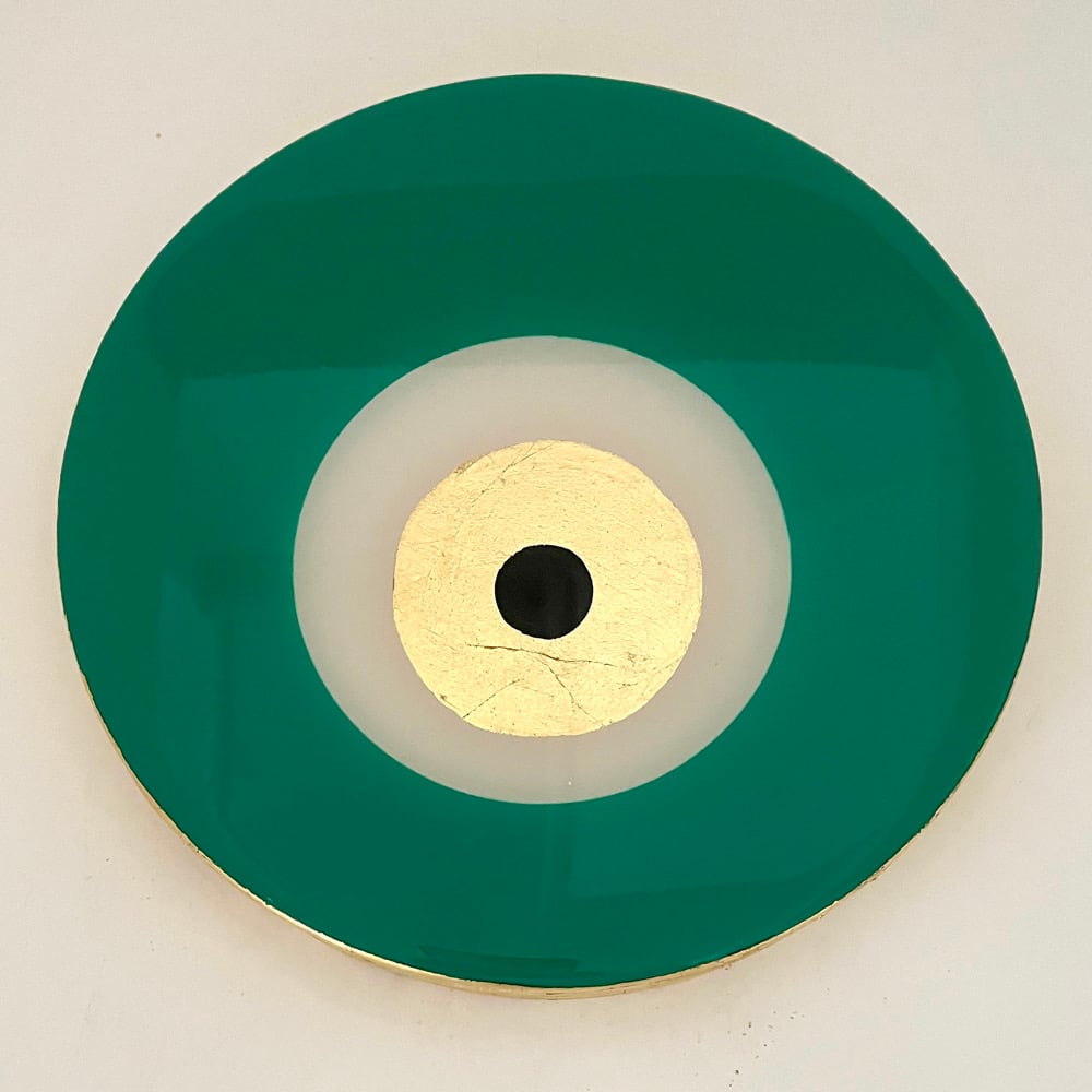 Hand painted canvas with enamel, acrylic and gold leaf and coated with resin.