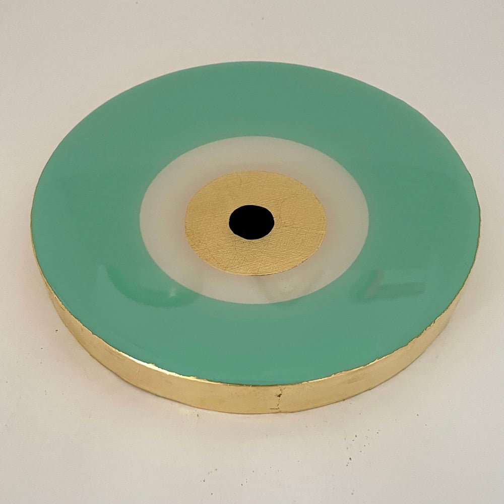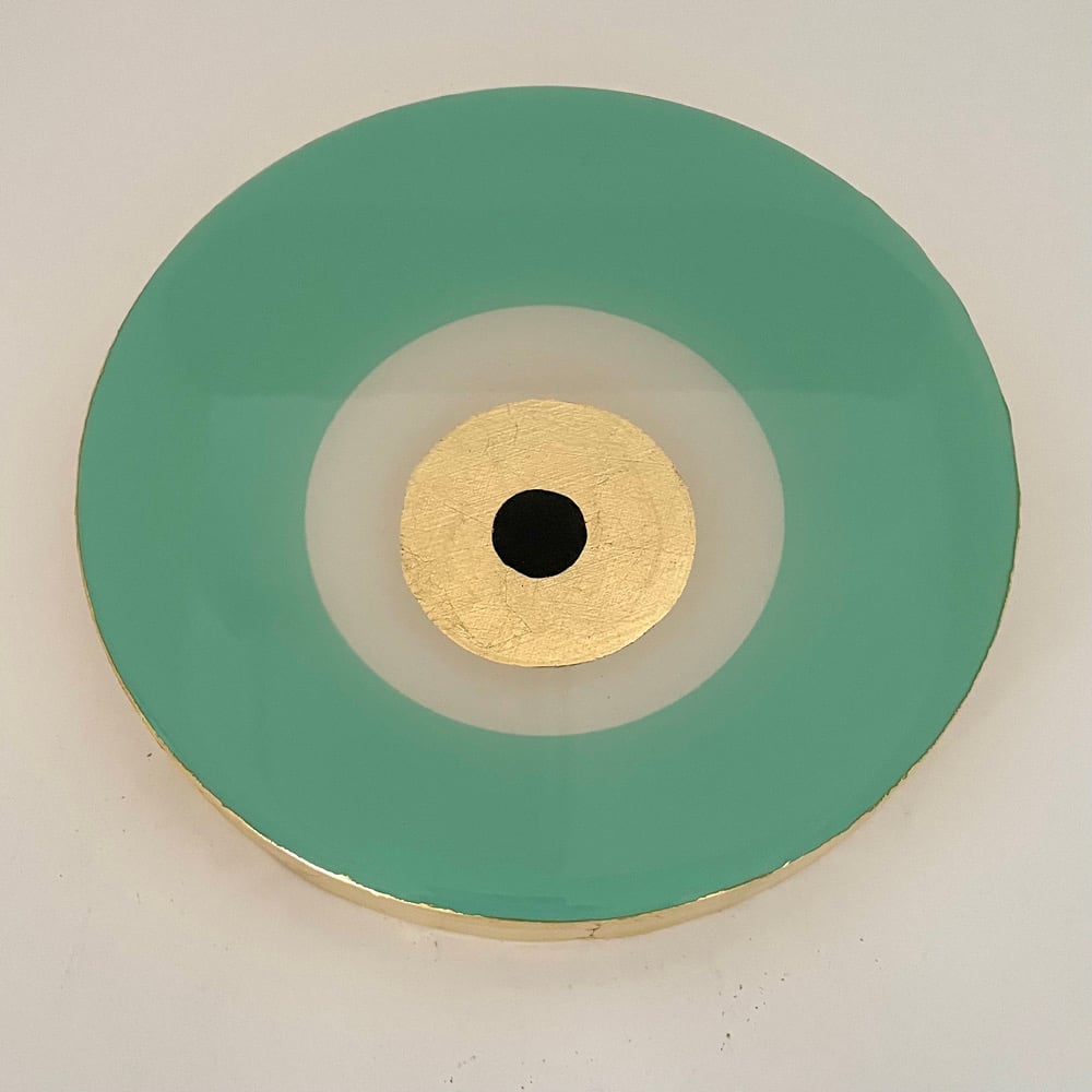 Hand painted canvas with enamel, acrylic and gold leaf and coated with resin.
