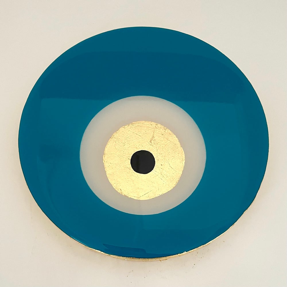 Hand painted canvas with enamel, acrylic and gold leaf and coated with resin.