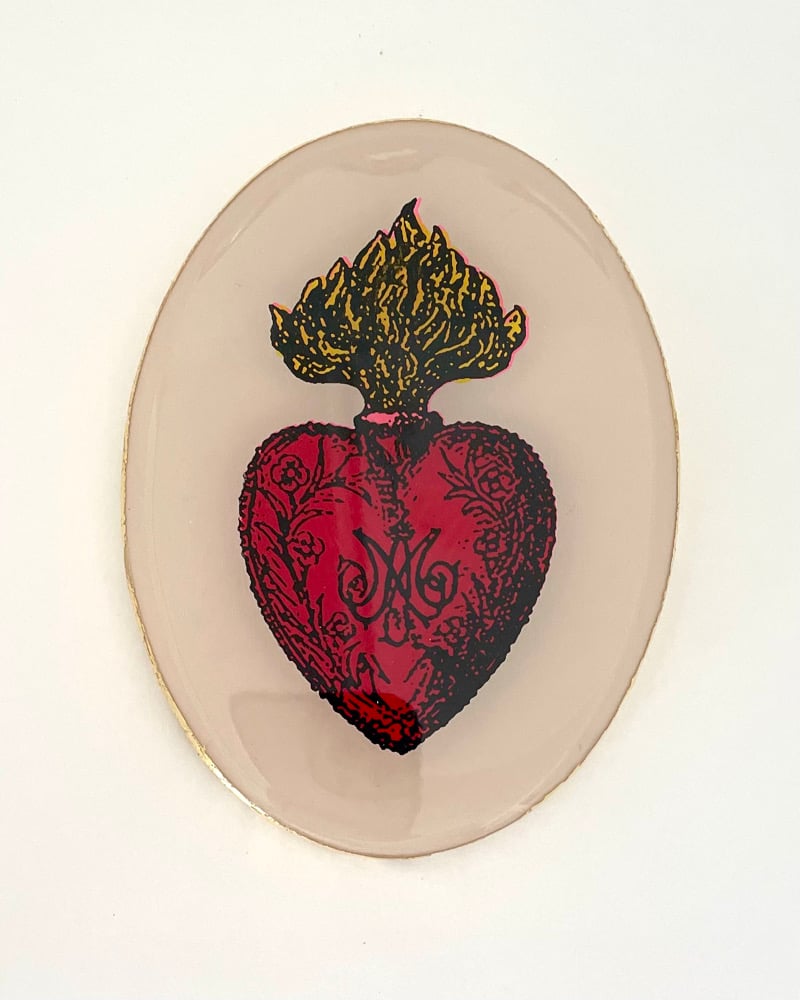 Hand painted screenprint with acrylic and enamel on laser cut wood coated in resin and gold leaf edges.